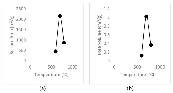 This sample’s BET surface area and pore volume results demonstrated the highest values observed at 700 °C as shown in Table 7 and Figure 2a,b. Furthermore, the surface area and pore volume plots exhibited similar trends. The following table and plot present the detailed results.