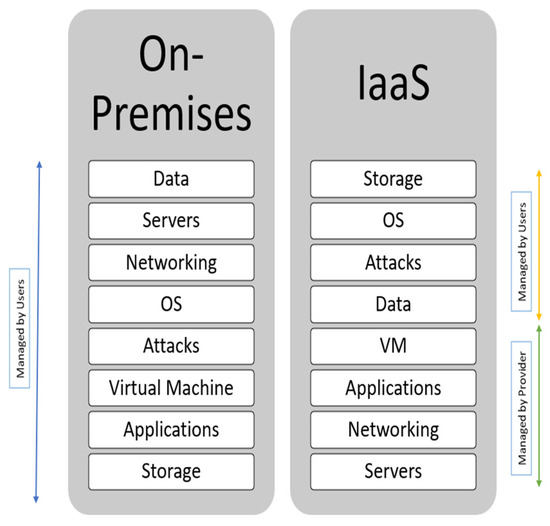 The majority of IaaS is made possible by utilizing dashboards and APIs. IaaS users, in contrast to the other two models, are responsible for managing many aspects of the infrastructure applications, data, runtimes, middleware, and operating systems, while the provider is responsible for servers, storage, networking, and visualization layers [16]. The infrastructure remains under the user’s control, while security, identity, and access management remain the responsibility of the end user, not the vendor defined in Figure 3. Services are available for resources like CPU, memory, and storage, which are just a few of the fundamental components of IaaS’s computing power [5,6,7]. There is no need to spend money on costly infrastructure because the vendor provides the resources. It is extremely scalable [17]. Although IaaS has several advantages, there are certain disadvantages that must be addressed, e.g., downtime, issues with performance, increased bills, etc. Otherwise, there is a chance that one will make significant errors when designing or using cloud infrastructure [9,10,11].
