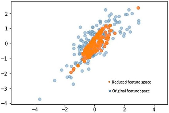 In the given Figure 1 illustrating the application of Principal Component Analysis (PCA), the original feature space is represented by a cloud of data points in a high-dimensional setting, each point characterized by multiple features. PCA identifies the principal components, which are orthogonal axes in the original space that capture the maximum variance. The reduced feature space is then visualized by projecting the data points onto a subset of these principal components, effectively transforming the data into a lower-dimensional space. This reduced space retains the essential patterns and relationships present in the original data, facilitating a more concise representation that is conducive to analysis, interpretation, and potentially improved computational efficiency. The figure visually demonstrates how PCA simplifies the data representation by emphasizing the directions of greatest variability and creating a reduced feature space with fewer dimensions while preserving the crucial information in the dataset.