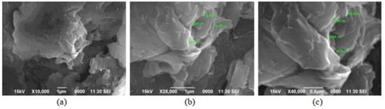 Examination of GO sample using SEM: (a) 10k magnification; (b) 25k magnification; (c) 40k magnification.