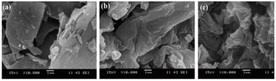 10,000× magnification SEM image of (a) graphite; (b) GO; (c) rGO.