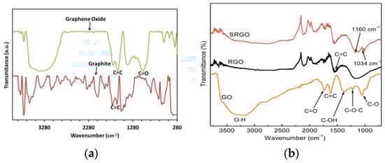 FTIR (Fourier transform infrared) is the most common form of infrared spectroscopy. FTIR spectra analysis was performed to investigate the structure and functional groups of the materials [35]. FTIR analysis of rGO showed O-H (~3464 cm⁻1), C=O (~1639 cm⁻1), C-OH (~1288 cm⁻1), C-O (~1003 cm⁻1) peaks, with weak C=C (~1493 cm⁻1), indicating GO oxidation. Reduction weakens/eliminates peaks over time [1,36]. Peaks at 1081 cm−1 (C-O bond), 1630–1650 cm−1 (C=C bond), and a broad peak at 2885–3715 cm−1 (O-H stretch), confirm GO’s absorbent nature (Figure 3) [17,18]. The peak at 2135 cm−1 identifies the Si-H group [21]. The broad peak from 2885 cm−1 to 3715 cm−1 indicated absorbed water, supporting GO’s high absorbency and gel-like behavior [37,38]. FTIR spectroscopy assesses oxygen-functional group integration in carbon lattice, identifying key modes such as C-O, C-OH, O-H vibrations, C=O, and C-H stretching vibrations [39]. Peaks at 1726 cm−1, 1115 cm−1, and 1074 cm−1 confirm graphite oxidation and hydrophilicity [40]. GO exhibits C-OH (3407 cm−1) and -COOH (1730 cm−1) groups [41]. FTIR analysis reveals GO has C-O, C-O-C, C-OH, C=O, and O-H peaks. rGO reduced (1160 cm−1, 1550 cm−1). SRGO sulfonated (1034 cm−1, 1160 cm−1). The results suggest the successful sulfonation of rGO, enhancing solubility, stability, and dispersibility in polar solvents (Figure 3) [42]. GO composite exhibits MgO-water interaction, decreased GO peaks, hydroxyl stretching/bending, and carbonate symmetry [43]. GO and rGO undergo hydroxyl, carboxylic, and carbonyl group elimination with heating, leading to exfoliation in 7 min [44].