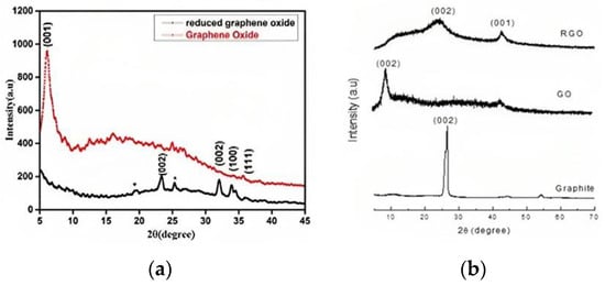 XRD uses the crystal diffraction of X-rays to study the crystalline structure, lattice parameters, phase analysis, and texture. The peak position reveals composition, while the intensity provides structural and phase information. [45]. The most common peak in graphite is 2θ~26.6° [38], for GO it is 2θ~10.2° [34,38,46,47,48], and for rGO it is 2θ~23° [48]. Sharma et al. (2017) used XRD with a copper rotating anode and found that GO had a primary peak at (001) with a d-spacing of 1.45 nm, while rGO had a smaller d-spacing of 0.379 nm due to the removal of oxygen-containing functional groups. The large peak at 2θ = 19.6° in rGO suggests incomplete oxidation (Figure 4a) [5]. In some results, graphite shows peaks at 50.68° (101), 54.62° (004), 59.84° (110), and 71.96° (112), indicating its crystalline structure. GO exhibits a sharp peak at 10.24° (002) with an interplanar distance of 0.80 nm [18,39]. An analysis of graphite, graphene oxide (GO), and reduced graphene oxide (rGO) shows graphite’s strong peak at 26.62° and confirms its well-organized layered structure; GO showed a shifted peak at 9.03°, indicating complete oxidation and rGO had a wider peak at 24.10°, indicating restored conjugation (Figure 4b) [23]. GO also revealed turbostratic disorder with a peak 2θ = 43° [49]. XRD analysis of low GO shows a 002 reflection at 26.3°, suggesting a 12.9 nm thickness and 38 layers of the graphite-like structure [50]. For graphitic layers, coal shows peaks at 26.05°, 41.51°, and 55.97° (002, 101), respectively. Successful synthesis from coal is confirmed by the 14.26° (001) and 42.25° (100) peaks on the GO spectrum [51]. GO exhibits a peak at 10.57° and a wide range (15–25°), corresponding to stacked GO nanosheets and graphite layers [52].