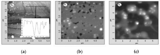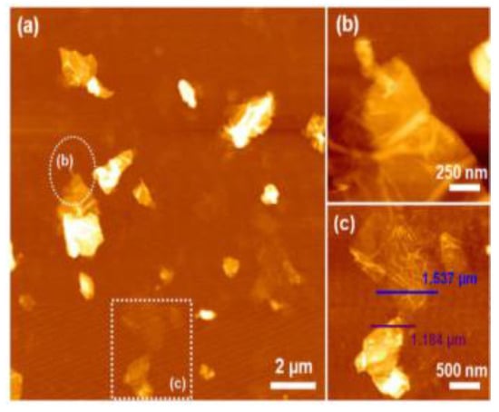 Krishnamoorthy et al. (2013) revealed the morphology of GO sample S-6 using AFM, depicting sheet-like structures with distinguishable single- and few-layered GO. (Figure 5). Clustering and self-assembly during drying caused multiple layers. Monolayers exhibited folds and high transparency, while wrinkles were observed in both monolayer and few-layered GO [38]. In tapping mode to image spray-coated materials on mica. Graphene oxide exhibited a layered morphology with a thickness of approximately 25 nm, containing embedded iron oxide particles of different sizes in samples S1 (70 nm) and S5 (200 nm) (Figure 6a–c) [53]. Treating a silicon substrate with drops of GO and rGO allowed them to dry for 30 min. The result was separate GO sheets (1.2 nm) and wrinkled, aggregated rGO sheets (1.05 nm), possibly due to exfoliation variations [54].