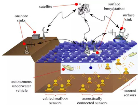 In another study, a specially designed platform was created for underwater sensor networks to enable the extended monitoring of coral reefs and marine ecosystems [6]. This network includes static and mobile underwater sensor nodes communicating via high-speed optical and acoustic protocols. These nodes can sense a variety of things, such as pressure, water temperature, and cameras, which allows for extensive data collection. The research addresses practical concerns unique to underwater networks, distinguishing them from terrestrial radio-based sensor networks [7,8]. It covers physical, technological, and economic distinctions, aiding researchers in transitioning from terrestrial to underwater networks.