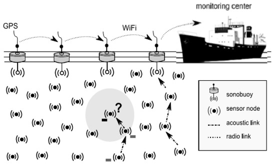 In summation, the studies covered span an expansive landscape within the realm of underwater sensor networks. The topics traversed encompass communication architectures, channel characteristics, pragmatic concerns, routing protocols, data aggregation methodologies, and security paradigms [16,17]. Collectively, they illuminate the multifarious challenges and plausible pathways for enabling effective and efficient communication within the intricate underwater realm. Arrow mark indicates the acoustic link from one sensor node to other sensor node, question mark indicates the no communication from the sensor node (?) to other sensor node which is mentioned in Figure 2.
