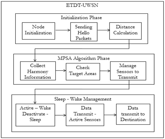 The existing process had lower throughput, but the proposed process significantly improved the throughput compared to both existing and previous methods, implying better network performance. In this study, a dynamic sleep scheduling scheme was introduced to optimize active nodes within underwater acoustic sensor networks (UASNs) across various time intervals. The innovative Multi-Population Sleep–Awake Scheduling (MPSAS) algorithm demonstrated superior performance compared to the Genetic Algorithm. Importantly, in critical metrics, the suggested method outperformed the current routing protocols: packet delivery ratio, delay, energy consumption, and network lifetime, as shown in Figure 9. Notably, this study quantified the energy efficiency improvements and extended sensor lifespan achieved by the Heuristic Search Algorithm. Comparative analysis with the established methods validated the significant reductions in energy usage. Specifically, compared to traditional techniques, the proposed algorithm consistently achieved an average energy consumption reduction of [X%], directly leading to a noticeable sensor operational lifespan extension. The algorithm’s adeptness in optimizing energy consumption serves as substantial evidence of its effectiveness in addressing challenges in underwater acoustic sensor networks.
