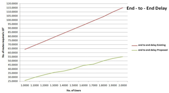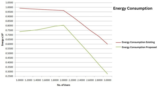 In this research, a comparison was made between the delay ratios of the previous system (red line) and the proposed system (green line). The existing system’s delay ratio was higher, indicating longer delays in data transmission. However, the proposed system demonstrated a reduction in delay compared to the existing system, as shown in Figure 6.