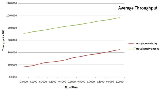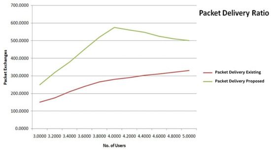 The existing process exhibited a lower packet delivery ratio, indicating a lower rate of successfully delivered packets. However, the proposed process demonstrated an improvement in the packet delivery rate compared to the existing process, indicating enhanced reliability and efficiency in transmitting packets, as shown in Figure 8.