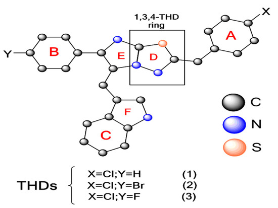 Despite the abundant literature on 1,3,4-THDs, not enough documentation has been reported on the origin of their structural stability, inherent reactivity, and binding affinity to important enzymes of SARS-CoV-2. As an original contribution to this noteworthy challenge, the present study discusses, in an informed tone, the structure, the reactivity, and the binding affinity of three 1,3,4-THDs (general scheme shown in Figure 1), whose crystal structure was laconically reported by Shamanth and coworkers [13,14,15]. For the sake of clarity, the six rings in compounds 1–3 have been labeled from A to F, with ring D corresponding to the 1,3,4-THD skeleton. Although they share most of their structural features, the titled compounds still differ by either the number and/or the type of substituting halogen atoms inserted in the A and B rings, which was expected to induce local variations.