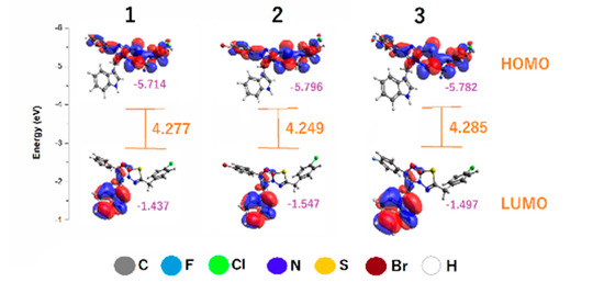 HOMO and LUMO orbitals of compounds 1–3 at the B3LYP/6-311++G(d,p) level.