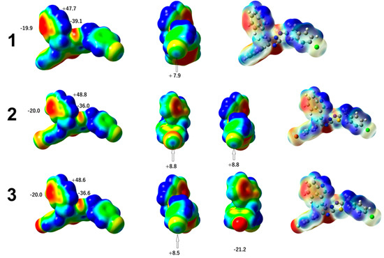 Molecular electrostatic potential (MEP) maps of compounds 1–3 generated at the 0.001 isosurface.