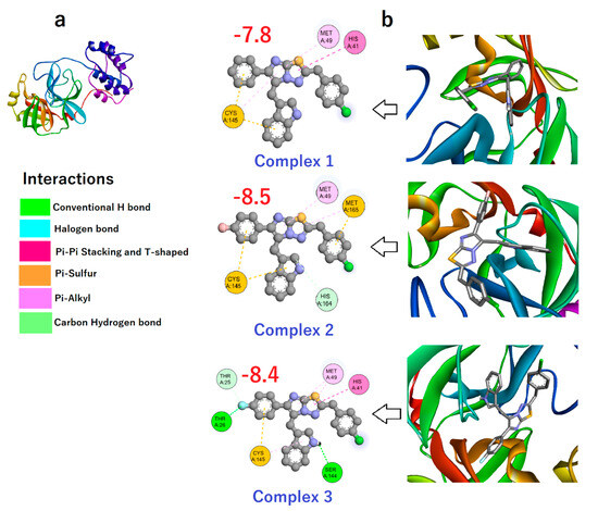 Figure 6b displays the best-docked poses and 2D interaction diagrams of all ligand-protein complexes. Predicted binding energies fall within the range of −7.8 to −8.5 kcal/mol, which suggests an overall favorable and spontaneous packing of the ligands inside the active site of the Mpro. The THD candidates have slightly higher binding energies compared with the co-crystallized native ligand (i.e., −6.8 kcal/mol using Autodock Vina), which often serves as a positive control [37,38]. This suggests that the three candidates are likely to possess inhibitory activity. This finding is consistent with the widely approved antimicrobial properties of THD-containing molecular frameworks.