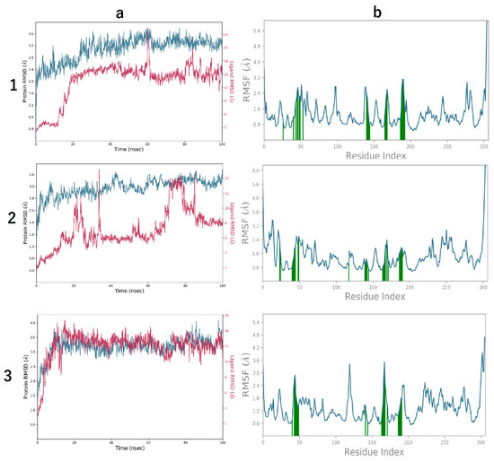 MD simulations of protein-ligand complexes involving Mpro and each of compounds 1–3. (a) RMSD and (b) protein’s RSMF.