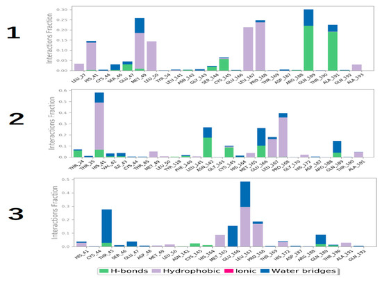 The number of contacts established between the protein and the ligands is one of the main factors that correlate with the dynamics of protein-ligand complexes. Note that some residues form more than one contact with the ligand. Complex 1 is initially stabilized by four noncovalent interactions, but this number fluctuates over the simulation (zero and seven contacts). At the end of the simulation, ligand 1 is still forming three contacts with the Mpro, and these involve SER46, LEU50, and PRO168. PRO168 and LEU50 mostly form hydrophobic bonds and water bridges, while SER46 engages with hydrogen bonding contacts and water bridges (see Figure 8). Regarding the contributions to protein-ligand interactions, GLU189 has the most pronounced contribution (~30%), followed, respectively, by MET19 (~25%), PRO168 (~25%), ALA191 (~23%), and LEU167(~20%). Protein-ligand complex 2 is stabilized by up to 9 contacts during the simulation time. HIS41 has the highest contribution, occurring in contacts for about ~55% of the simulation time. These contacts include hydrophobic interactions (dominant), H-bonds, and water bridges. Other important residues include PRO168 (~40%), ASN142 (~30%) and GLU166(~30%). Finally, compound 3 develops four to six contacts with the Mpro in the early steps of the dynamics, and this number varies between zero and five all over the simulation. Throughout the simulation, amino acid residues like ASN142, CYS145, and HIS164 only establish hydrogen bonds with the ligand, while MET49, LEU50, MET165, and ALA191 only occur in hydrophobic interactions. The rest of the contacts involve residues that, in addition to attaching to the ligand, also bind to water molecules. LEU167 has the highest contributions (~48% of the simulation time) to protein-ligand interactions, which are decomposed into hydrophobic contacts and water bridges.