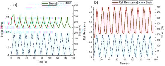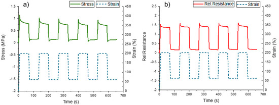 (a) Dynamic stress and (b) relative resistance sensor signal response of the FDM printed TPS strips with the integrated strain-sensing element during cycling between 0 and 200% strain.