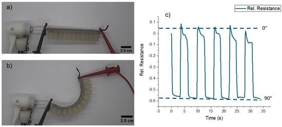 As expected, a negative piezoresistive behavior was observed, due to the compression. Nonetheless, the sensing element exhibits a monotonic response, and it is possible to distinguish between the two positions (0° and 90°) of the bending actuator.