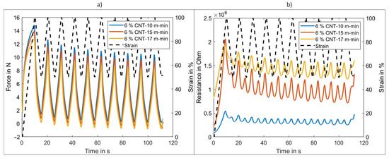 Additionally, CNT yarns with a constant winding speed of 15 m/min but different filler contents were evaluated. With rising filler content, the elastic modulus increased as expected. The base resistance of the 5 wt.% CNT samples was higher than that of the 4 wt.% ones. However, as to be expected, after the first loading cycle the resistivity for the material with lower CNT content rose significantly. Thus, the conductivity increased with a higher CNT content.