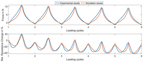 Comparison of experimental and simulation results with regard to the longitudinal force and relative resistance change for 6 wt.% CNT and a winding speed of 15 m/min.