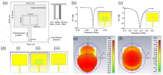 The initial design (D1) (Figure 1d(i)) was simulated using CST Microwave Studio (version 2019) and the resonating frequency was found to be 4.122 GHz. D1 was modified (Figure 1d(ii), D2), and resonant frequency, S11 and electric field were found to be 4.2832 GHz, −17.14 dB and 17.8 dB V/m, respectively. D2 was further modified (Figure 1d(iii), D3) in two patches by introducing a gap in the center. This final design has resonant frequency, S11 parameter and maximum electric field at 6.376 GHz, −14.8565 dB and 21.5 dB V/m, respectively. This design has an enhanced radiation field and has applications in advanced biomedical, agriculture and wireless technology [11,12,13]. To check the sensitivity, ten biological phantoms were loaded on D2 and D3. We found that the shift in resonant frequency and S11 response reached the maximum in the D3.