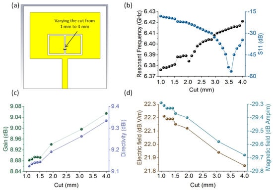 CST Simulations: (a) Front view of the design, (b) The change in resonant frequency and corresponding maximum S11 response, (c) Maximum Gain and Directivity, (d) Maximum electric field and magnetic field by varying the cut from 1 to 4 mm as shown the above patch shown in Figure 1d(iii)).