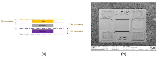 The 500 µm × 500 µm × 15 µm strain gauge with five contact pads is realized on silicon on insulator. Four wire-bondable contact pads are placed at the corner edges while the fifth pad is located on the insulator between two corner edge contact pads. The structure of the wire-bondable pads consisting of Ti/Pt/Au stacks is illustrated in Figure 1a. The strain gauge itself is completely integrated within ceramic by pressure sintering at 875 °C.