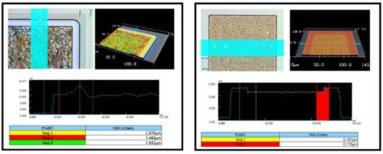 (a) Laser profilometry on corner contact pads and (b) laser profilometry on the center contact pad.