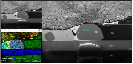 Traditional mechanical treatment of samples such as grinding and polishing for subsequent structure analysis results in deformations and artifacts that make the visualization of the material structure difficult or even impossible [1,2]. Focused ion beam (FIB) tools are a popular alternative for analysis. Three functions are employed when using FIB which are partial etching, partial metal deposition, and scanning ion/electron microscopy (SEM). Partial etching by FIB can be used for cross sectioning on chip contact pads and scanning ion/electron microscopy can be included in in situ observations as suggested by Kaito et al [3] and applied by Nikawa et al. [4]. In the present study, FIB, SEM, and elemental mapping are used for the failure analysis of wire bonding on strain gauge contact pads on a cross section of almost 10 µm2.