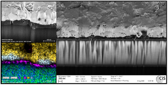 A significantly different situation is observed for the contact pad on insulator. Here, the three metal layers are segregated in between each other, and a more uniform metallization is realized even after firing at high temperature, as illustrated in Figure 5.