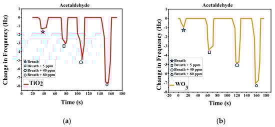 Sensor response of pure and acetaldehyde-spiked breath for (a) TiO2-PS and (b) WO3-PS modified QTFs.