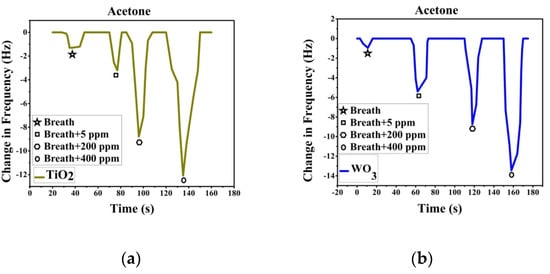 Sensor response of pure and acetone-spiked breath for (a) TiO2 -PS and (b) WO3-PS modified QTFs.