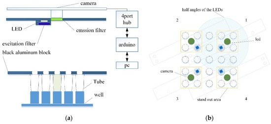 (a) System structure diagram; (b) 4 quadrants of all 5 × 5 wells: camera and LED location.