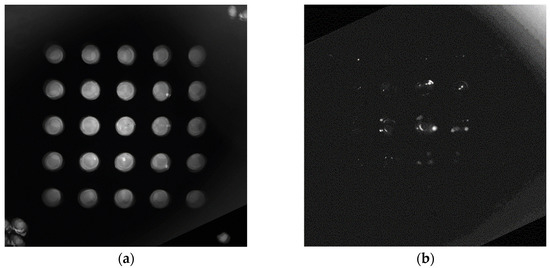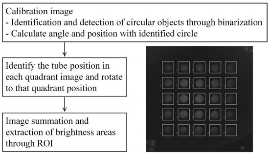 In order to stably fix the positions of 25 tubes in each quadrant, a mark sheet was made and then placed under an aluminum block well for calibration. Figure 2 shows the angle of the image rotation center used the relative position of the upper right end tube. Then, the angle between the center position of the 25 well and the x-axis of the image was calculated. For the experiment, FAM 5uMole and DDW, which are reference reagents similar to the fluorescence brightness after PCR amplification, were used. Each of the 25 wells was injected with 36 µL, and 4 images obtained by shooting were obtained as one integrated image through the above image processing process.