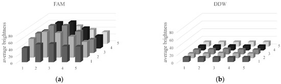 The average brightness of each of the 25 tubes is shown: (a) FAM image; (b) DDW image.
