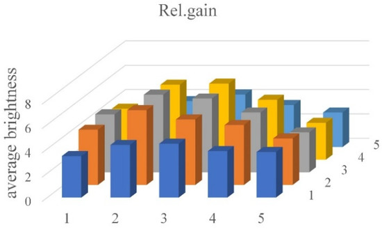 Figure 4 shows the average brightness of each of the 25 tubes. The left graph shows the image of FAM and the right graph shows the image of DDW. It can be seen that the average brightness of the tube image containing DDW is around 12, and the average brightness of the tube image containing FAM is generally over 55. Figure 5 shows the relative gain difference between FAM and DDW. In fluorescence detection, the brightness through relative gain is based on the tube at the same location in each well. It is a value obtained by dividing the brightness of DDW by the difference in brightness of FAM and DDW. Relative gains show more than 4 on average. Table 1 shows the average brightness and relative gain of tubes containing FAM and DDW.