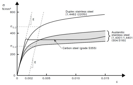 Representing the stress curves for stainless steel and carbon steel, P291: Structural design of stainless steel, Published by: The Steel Construction Institute Silwood Park Ascot Berkshire SL5 7QN. The stainless steel is polished, leading to an emissivity index of 0.16 to an environment temperature of +20 °C.
