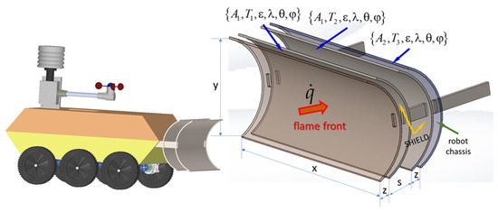 The preliminary characteristic situations for choosing a suitable material for the thermal shield are that the robot is stationary; the environment temperature is +20 °C; the atmospherically humidity is 60%; the atmospheric pressure is 1015 mbar; and the wind velocity is 0.5 m/s (Figure 2).