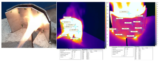 For this experiment we have used a flame obtained from burning liquefied petroleum gas, a hydrocarbons mix composed mainly of propane and butane. The jet flame has been oriented on the longitudinal axis of the shield until the moment when the temperature of the steel became constant. Direct contact with the flame occurred at temperatures over 150 °C. The plate width is 4mm (material: Inox 316L), and the exposure time is 4 min. The measurements acquired with the infrared thermometer are represented in the following figure (Figure 6).