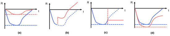 Different examples of defects (original signal in blue, defect in red). (a) Sensitivity loss leading to a lower resistance response to a gas concentration. (b) Signal jump causing an abrupt additive change in the signal. (c) Sensor stopping leading to constant sensor outputs and (d) battery loss causing a lower heating temperature, which leads to a slower sensor recovery process.
