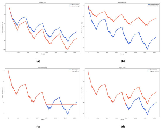 Different signal outputs for the different sensor fault types implemented in the stochastic model. (a) Sensitivity loss, (b) battery loss, (c) sensor stopping, and (d) signal jumps.
