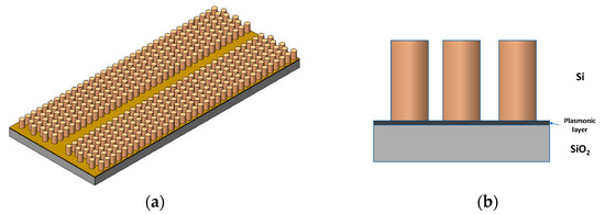 Scheme of the concept: A pillar type photonic crystal with a line defect as a waveguide structure is placed on a conductive layer. Pillars are made from Si. The plasmonic layer is deposited on SiO2 (a) overview, (b) cross section with layer stack.