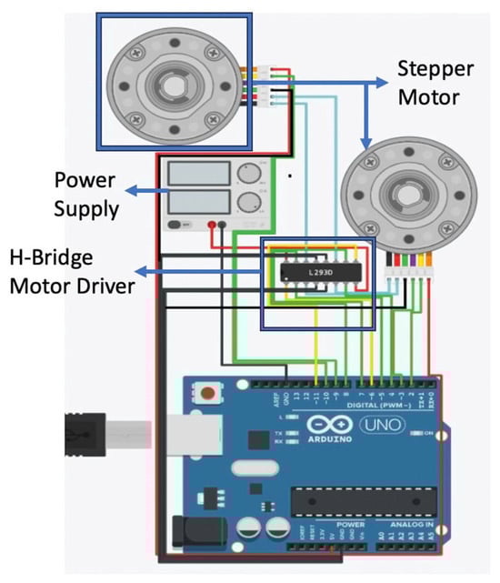 This system relies on pre-trained YOLOv3 deep neural networks and depends on Jetson AI computation support. Additionally, the robot’s operation necessitates an independent power source, separate from the motor driver batteries. To implement this proposed system, we require specific hardware components. This includes a pan-tilt Arduino equipped with two stepper motors, which respond to commands from Jetson Xavier and adjust accordingly. Similarly, we need a robot Arduino with four stepper motors designed similarly to receive commands from Jetson Xavier and move in all four directions. Figure 2 illustrates the connections for the pan-tilt subsystem, with the robot connections differing only by having four stepper motors instead of two.
