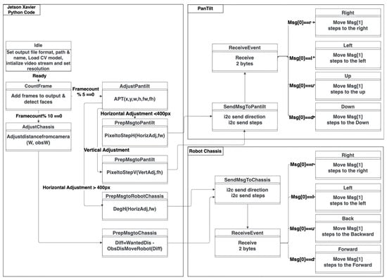 Figure 6 shows the proposed system flowchart, clarifying the states of each subsystem as well as the communication stages between the subsystems and Jetson Xavier. The FSM elucidates the various operational states initiated by Jetson AGX Xavier, impacting both the pan-tilt and the robot. It commences with the “idle” state, where essential parameters such as the file format, path, resolution, and filename configuration are established. Simultaneously, the computer vision model is loaded, and video streaming is initiated. These prerequisites lay the foundation for commencing the recording process. As the number of frames accumulates during the recording, the system initiates the detection of a human face. This detection process is triggered every 10 frames. Subsequently, a signal is transmitted to adjust the distance between the user and the robot chassis, taking into account any specified movements that need to be executed. Moreover, at intervals of every 5 frames, the pan-tilt mechanism receives instructions to commence its adjustment process, which can be either on the horizontal or vertical axis. Communication primarily relies on the I2C protocol to fulfill these operational requirements. The pan-tilt operates using discrete steps, while the robot chassis maneuvers based on specific angles and distances. The messages conveyed to the pan-tilt contain designated letters indicating the intended direction of movement; a similar operational protocol is adhered to by the robot chassis.