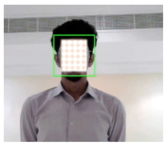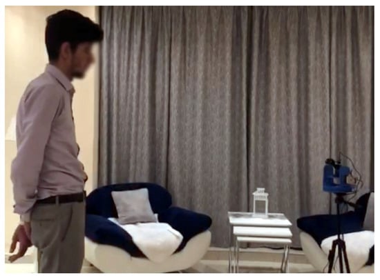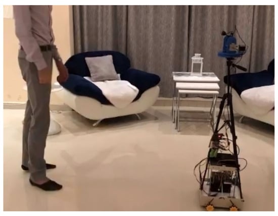 When Jetson AGX Xavier is activated, it establishes communication links to initiate the AI-based camera operation. The person using the system should be approximately 1.5 m away from the camera. When a face is detected by YOLOv3, the pan-tilt system adjusts every five frames to ensure the user remains in the initial frame by utilizing the Kalman filter. This keeps the content creator precisely focused, and a bounding box is drawn around their face to indicate the area that will be controlled. This information is continually communicated with Jetson during filming. The camera’s readings are sent to Jetson, which processes them and makes decisions. If adjustments are needed to the pan-tilt or the robot’s movements, the corrected instructions are promptly provided and implemented. The robot functions as a cameraman and can be directed to perform specific tasks while maintaining an appropriate distance from the user. We designed our robot to be roughly the same height as the average user to achieve results comparable to those of a human cameraman. Regardless of the user’s movements, the AI robot can follow and adjust the camera’s perspective to keep the user centered. The robot not only moves in parallel with the user but also synchronizes with the pan-tilt system, whether the movement is vertical or horizontal. Figure 7 illustrates the testing setup with the user initiating the robot and standing in front of it, while Figure 8 displays the camera view with the generated face bounding box, which aids in the centering and tracking of the content creator.