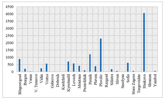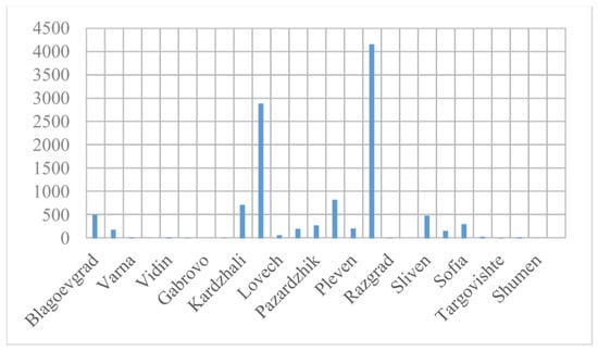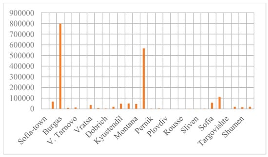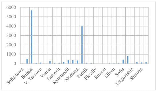 In this section, calculations have been made of the amounts of carbon dioxide released during forest fires for the last two years. The calculations were made for broadleaf and coniferous forests and were divided by the regions of Bulgaria. Figure 2, Figure 3, Figure 4 and Figure 5 shows the burned areas by region in Bulgaria for 2021 and 2022, and they are divided into broad-leaved and coniferous forests.