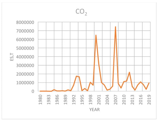 Figure 6 presents a calculation of the amount of released carbon dioxide (Es) by year, based on burned forest massifs. The calculations were made according to the following [6]: