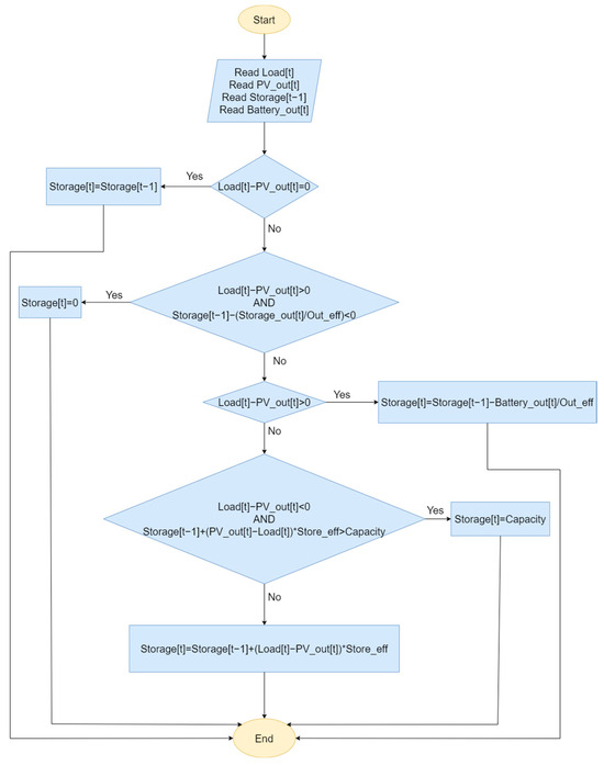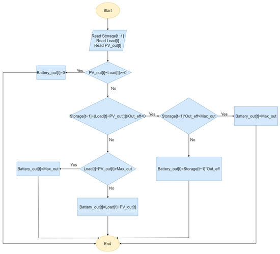 Initially, the output of the installed storage system for each hour, denoted as Battery out [ t ] , is calculated according to the description provided in Figure 6.
