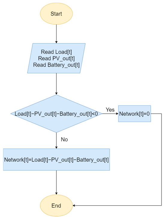When both the PV production and battery storage do not suffice for load satisfaction, the system imports power from the grid, the amount being calculated as shown in Figure 8.