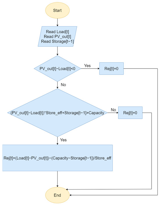 Since both the storage capacity and round-trip efficiency are limited, the amount of excess energy, after losses, produced by the photovoltaic system cannot be fully stored for all cases, therefore, rejections attributed to the system’s production should be considered and are calculated as shown in Figure 9.