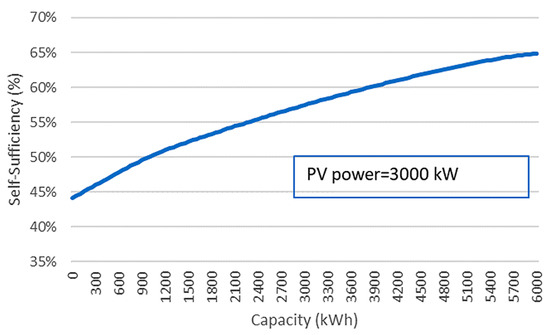 Without an installed storage system, the self-sufficiency cannot exceed 50%, therefore an energy system is indeed necessary to ensure the system’s independence from the network. For a fixed value of 3000 kW PV power, the relationship between self-sufficiency and the system’s storage capacity is presented in Figure 12.